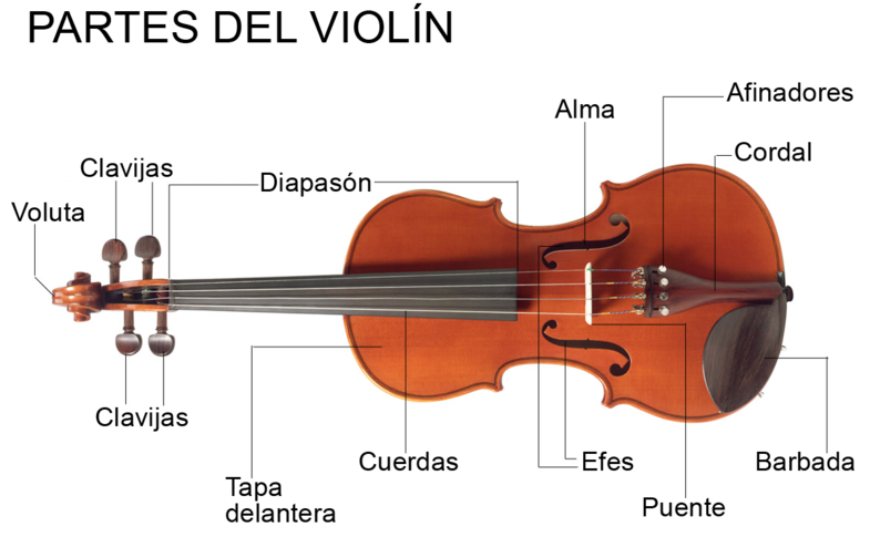 Es el más pequeño y agudo de los instrumentos de arco de la orquesta. Aparece en Italia a comienzos del s. XVI y con la viola y el violonchelo. Reemplaza a las violas de gamba, por su sonido más brillante y expresivo. Un luthier (contructor de violines) famoso fue Antonio Stradivari, que vivió; en el norte de Italia, en Cremona, en el s.XVII. El violín tiene 4 cuerdas, afinadas a intervalo de 5ª: sol - re - la - mi